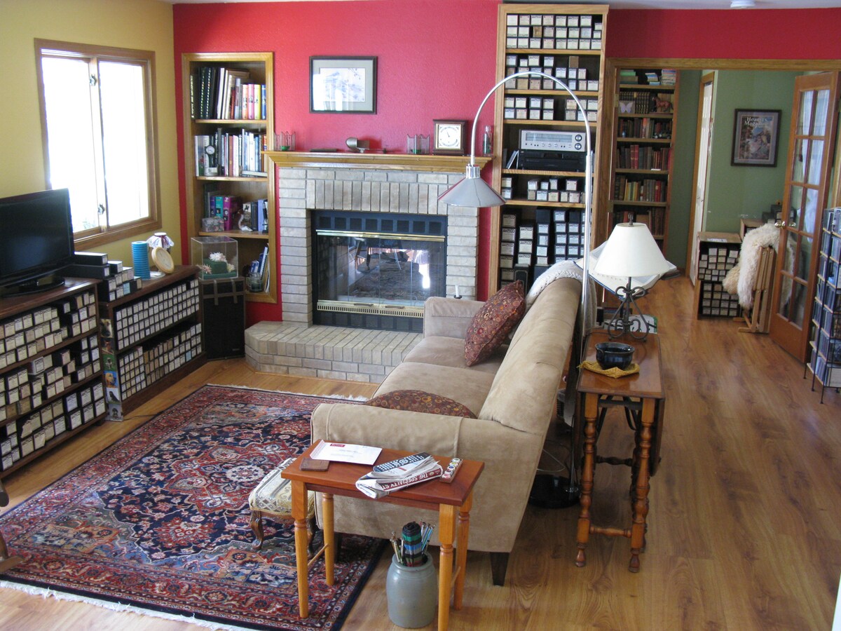 Boulder charm! GORGEOUS historic downtown 2-BD, 1-BA renovated 1910s craftsman bungalow, "Bluff Hollow,” located in central Boulder's historic neighborhood, but private-feeling, surrounded by a big yard and tall trees. Cute "forest" touches throughout. High ceilings, hardwood floors, retro-modern "foodies" kitchen. Wood fireplace, central AC, 55" TV, huge velvet sofa. FAST fiber optic internet (2 workspaces.) One BD has a Cal King, one BD has a King + a twin (and almost feels like 2 rooms).