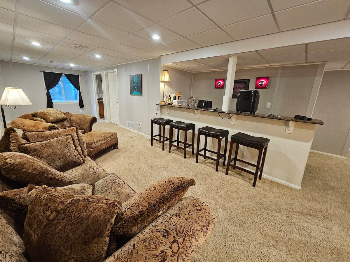 Welcome to Loveland, a community nestled in the foothills and a gateway to Rocky Mountain National Park. Our downstairs suite is 600 sq. ft. in our private home. There is a bedroom with a queen bed and a large, private full bath. The Living Room features a fireplace, sofa, sitting chairs,TV, table, and an additional queen size bed. The suite includes a mini kitchen for cooking simple meals and snacks. WE LIVE ON THE MAIN LEVEL and will be available if needed.