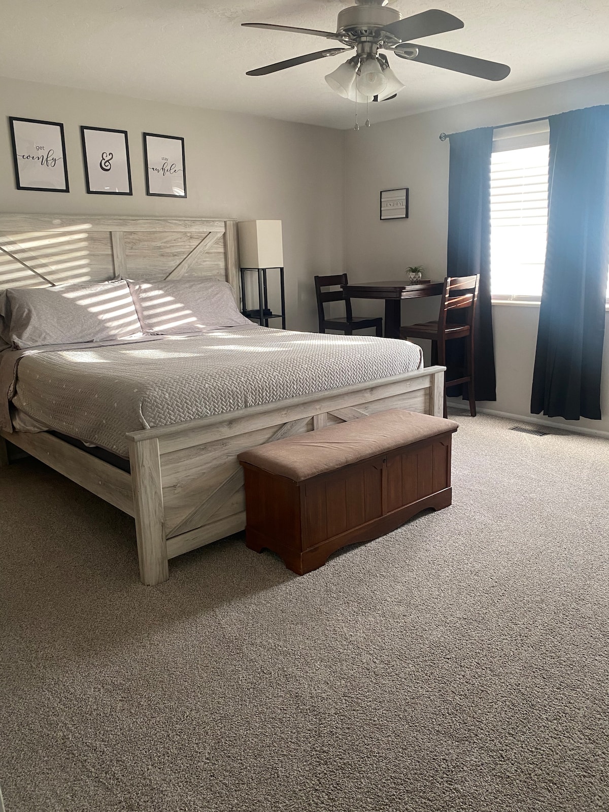 This is a nice comfortable basement. It has one queen bed, sofa bed and I have a queen air mattress available as needed. It has a bathroom and closet. The suit is equipped with a full fridge, microwave, coffee maker, toaster, dishes and a smart TV for your own convenience and comfort. It does not have a private entrance, but the basement door is close to the garage door, so you will have a direct entrance to the studio. You will be close to the freeway, train and shopping centers.