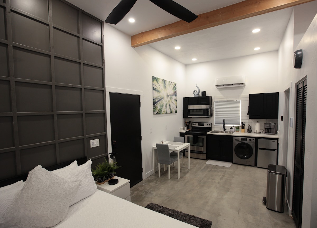 Unwind in the natural light and luxurious appointments of this modern studio nestled up to a city park and attached to our main house. Beautifully renovated and flooded with light, the spacious 375 sq ft is your perfect home-away-from-home for exploring the wonders of Flagstaff and northern AZ. Amenities like plush bedding, a fully-stocked kitchenette, and a smart TV combine with extra touches like laundry, a rainforest shower, relaxing shared patio, and 400 MB wi-fi. Note: No A/C. Welcome!