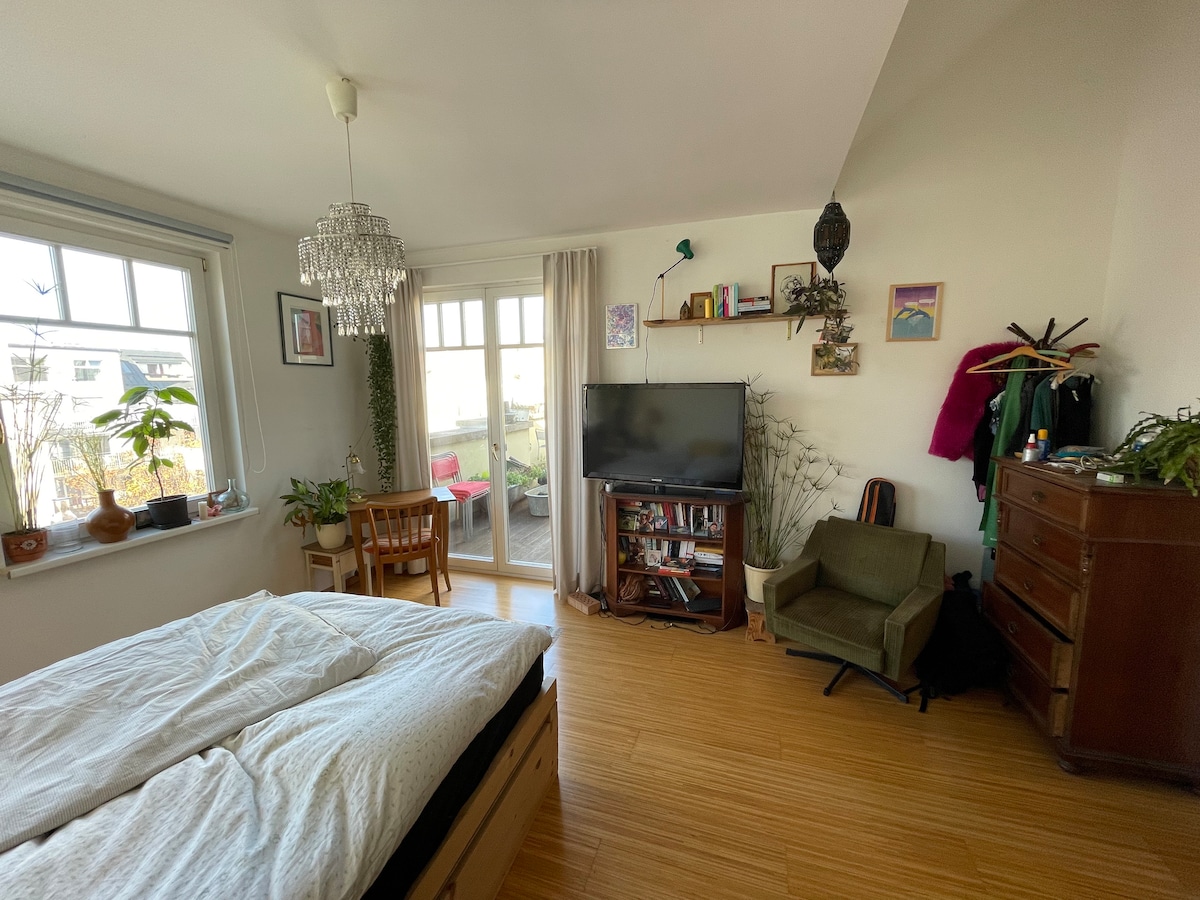 Loft mit ausgezeichneter Anbindung in die Innenstadt und großem Natur Park ums Eck. Vermietet wird ein Loft mit Wohnküche, Arbeitsplatz, Badezimmer mit Toilette und einem geräumigen Balkon in den Innenhof. Schnelles 150mbits WLAN und eine Kaffeemaschine incl. Kaffee stehen zur Verfügung. Die Küche ist voll ausgestattet und mit Gewürzen gefüllt. Im Schlafbereich befindet sich ein Leselicht pro Seite und mit einem internetfähigen Fernseher können alle Streaming-Plattformen genutzt werden.