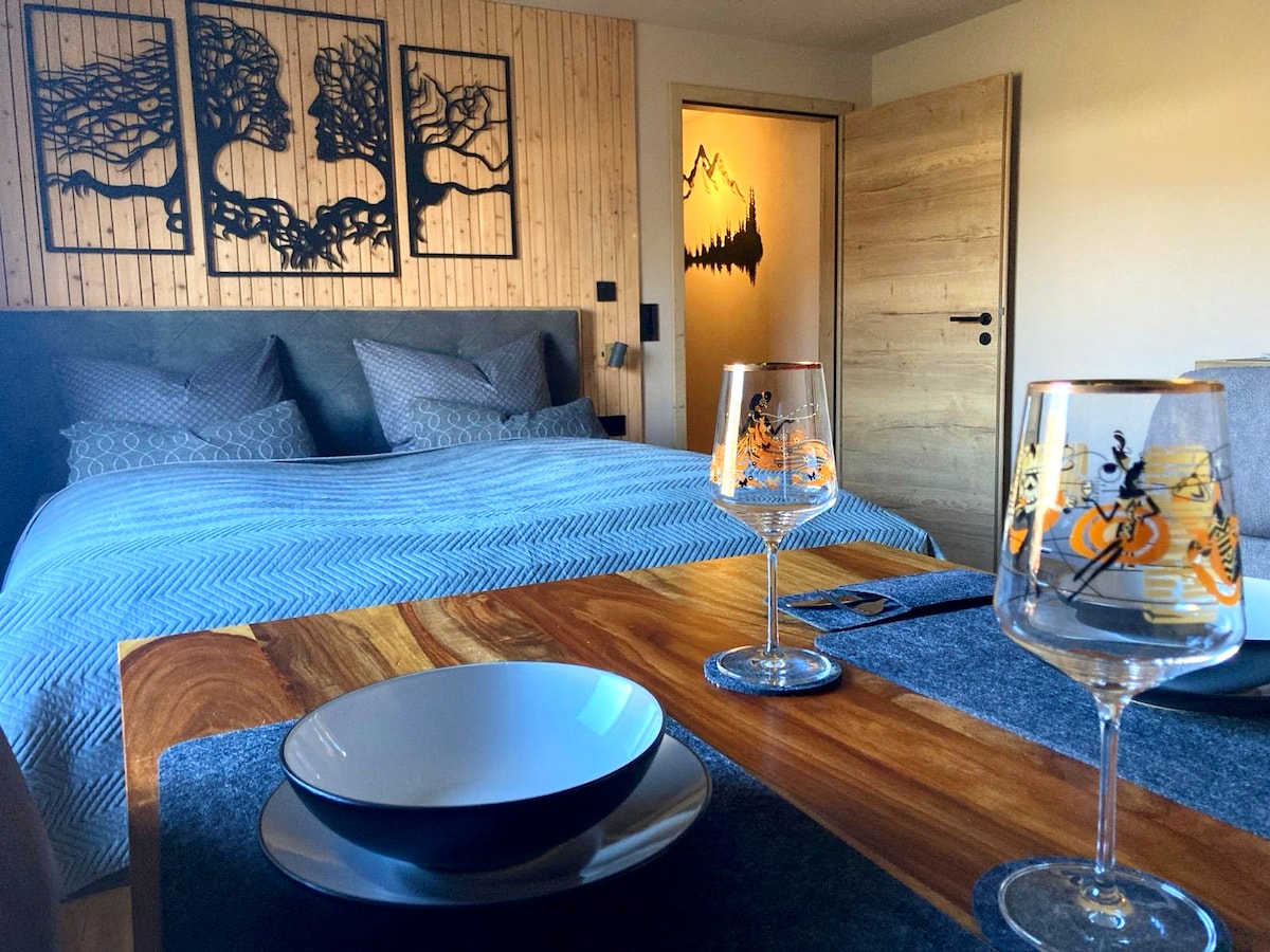 Unsere gemütliche 34m² Ferienwohnung für Familien (maximal 2 Erwachsene) oder Paare bietet einen kombinierten Wohn-/Schlafbereich mit Boxspringbett, ein separates Schlafzimmer mit Stockbett für Kinder und eine voll ausgestattete Küche. Genießen Sie moderne Unterhaltung mit WLAN und Smart-TV. Das moderne Bad bietet eine Regendusche. Ein reichhaltiges Frühstücksbuffet ist inklusive. Nutzen Sie Gemeinschaftsbereiche wie den Garten, Pool (saisonabhängig) und den tollen Ausblick auf den Dreisessel.