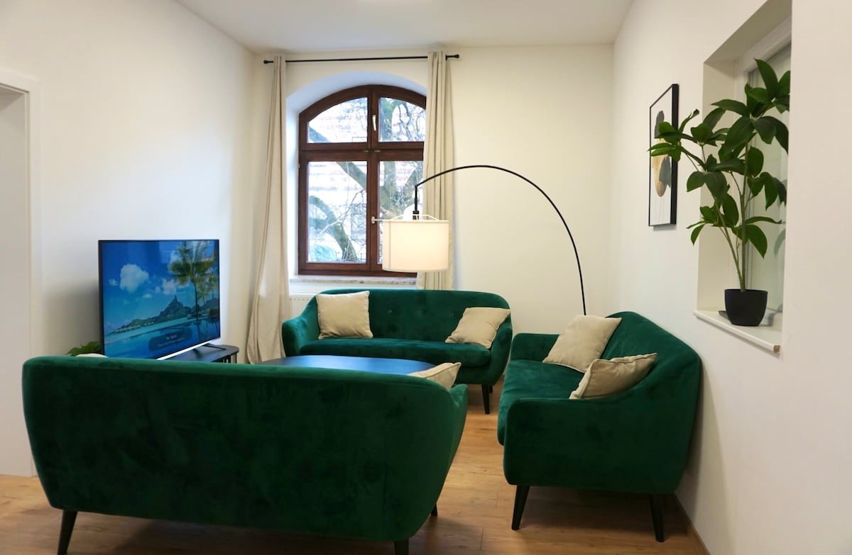 Welcome to JH Apartments Landshut – your premium loft in a historic monastery building, where history meets modern luxury amenities! Highlights: → 2 underground parking spaces (rare in Landshut!) → 100-inch home cinema TV + 2x PlayStation 5 → Private terrace for relaxation → Premium kitchen: SMEG & Dyson equipment → High-speed WiFi & gaming/home office area → 5 minutes to Old Town & Trausnitz Castle JH Apartments – perfect for business travelers, families, and gaming fans!