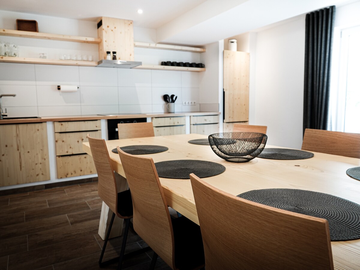 Enjoy quality time together in our 256 m² penthouse featuring a rooftop hot tub and an XXL panoramic terrace. Relax in the warm water while taking in stunning mountain views and the neighboring Penninger Distillery. Perfect for families and groups seeking comfort, nature, and relaxation. With the Saußbachklamm trail just steps away, it’s the ideal starting point for exploring the Bavarian Forest.