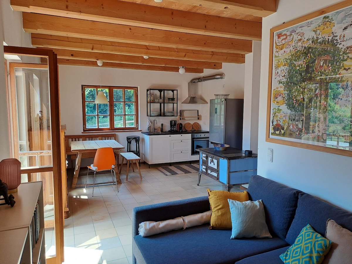 Stylish restored old barn in a stunning secluded location, offering 120 sqm of space with panoramic views of the countryside, a 50 sqm gallery with large windows, an infrared cabin, a walk-in shower, a bathtub, a luxury designer kitchen, terrazzo marble flooring with electric underfloor heating, a historic tiled stove from 1700 and a fenced garden for as many dogs as you like. A dream just 15 min. from Passau, 3 min. from the motorway, and 10 min. from the Danube. Bookable from Nov 2025