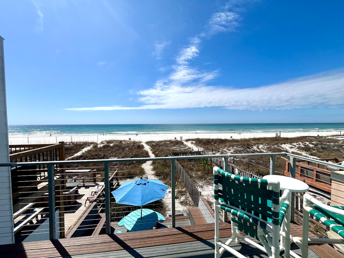 This nostalgic beach front home overlooks the white sugar sand beaches of the Emerald Coast. With interior views of the ocean from the kitchen, living room, and both bedrooms, you are in for a treat! Private parking is right in front of the house, and you can enjoy one level throughout. If you have a large party, a 1 bedroom cottage is available on the same lot. **Note** The cottage is a separate listing and must be booked separately. You can find it under "Aqua-Holic Beach Front Cottage"