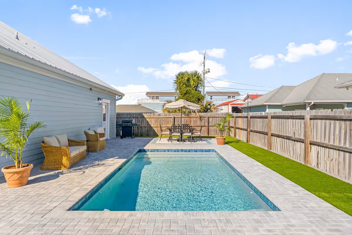 Welcome to Fan Palm Panama City Beach. We are located on the East end close to Thomas Drive and Highway 98. Our home features a private in-ground pool with lush landscaping and several outdoor sitting areas to enjoy your morning coffee, relax with a good book, or play yard games with the kids or pets. Inside our guests will find many upgrades with a fully equipped kitchen open to the dining, entertaining, and pool area. We welcome families and allow pets.