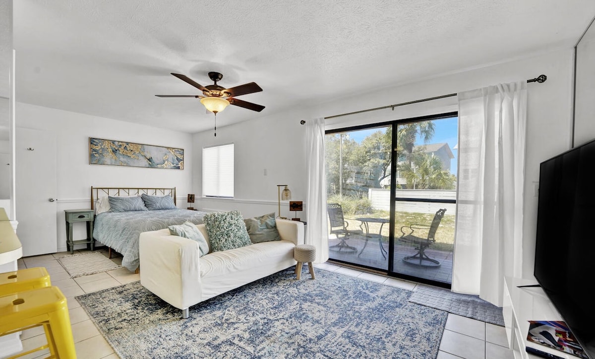 Updated, first floor studio, with all the comfort and amenities you'll need for your visit to the Beach. Have your coffee on the back porch looking onto the lake or take a 3 minute stroll across the street to the beach. Take a dip in the pool. Pier Park is 5 minutes away and has everything you would need. (Target, Fresh Market, endless food and bars). Rosemary is a 10 minute drive. 15 minutes to the airport. Enjoy the best parts of the beach and surrounding areas from here with ease.
