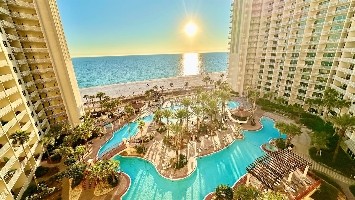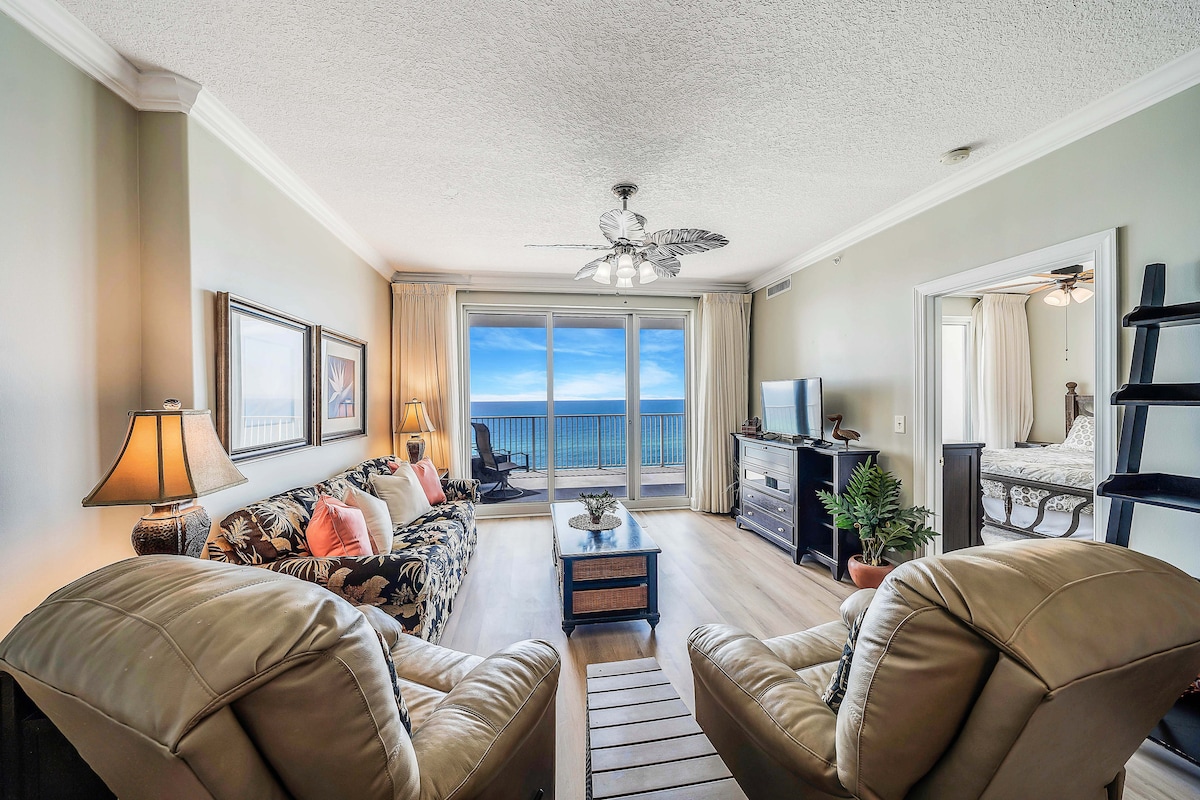 **Note: must be at least 25 to book. Enjoy beautiful sunsets on one of the largest decks on Panama City Beach. Newly updated oceanfront condo with breathtaking views and easy beach access. Nicely outside living space with pool & ocean views. Enjoy epic sunsets and sugary white sand in the spacious 4 bedroom 4 bath condo that comfortably accommodates our guests. Two Gulf Front master bedrooms with walk out balconies.