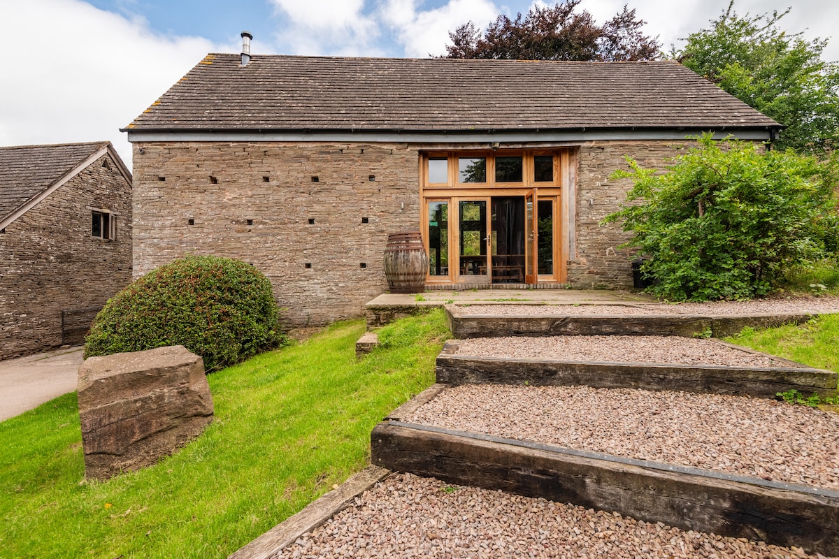 Self-contained luxurious annexe for one or two guests. A calm and comfortable space to relax in. Finished to an extremely high standard, with high ceilings and oak beams and posts. Fully insulated with underfloor heating, beneath flagstones. The kitchen is fully equipped with an oven and hob, microwave, Airfryer, fridge, dishwasher, washing machine. Set in a stunning, peaceful location on the border between England and Wales with breathtaking views. The perfect way to experience country life.