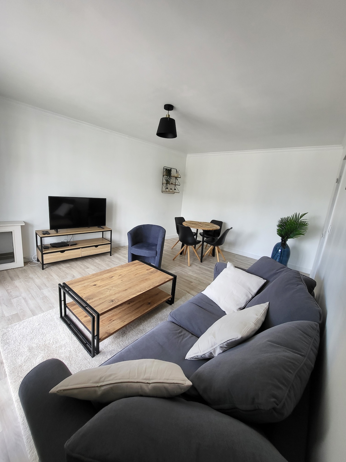 Profitez de cet appartement lumineux de 45m2, dans une résidence calme et sécurisée. -Cuisine équipée, frigo, four, plaques cuisson, micro onde, cafetiere, lave linge... - Grande pièce à vivre avec tv, table à manger et canapé lit convertible pour 2 personnes -Chambre avec literie de qualité et espaces de rangement, donnant accès direct à la salle de bain -Box pour 1 voiture A pied : -15min de l'hyper centre -10min de la gare -30min du Parc Expo Linge de lit et serviettes fournis.