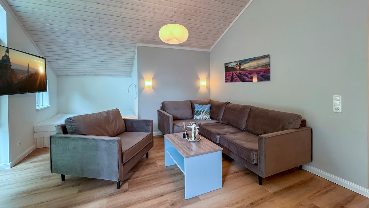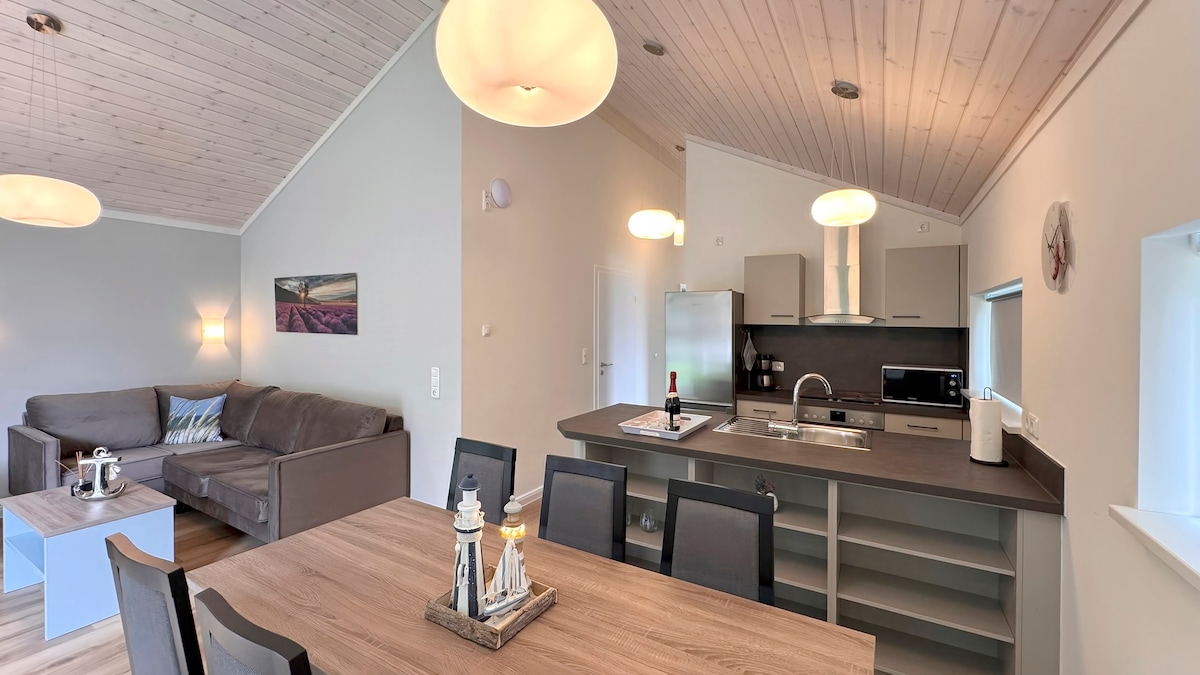 Modern 55 m² apartment in Fürstenau Suitable for up to 4 guests: bedroom with box spring double bed, living room with high-quality corner sofa. The fully equipped kitchen features an oven, stove, dishwasher, fridge with freezer compartment, coffee machine, kettle, as well as dishes, cutlery, glasses, pots, and pans. The price includes minibar, air conditioning, Wi-Fi, smart TV, and washing machine. All rooms are fitted with electric shutters, ensuring a pleasant indoor climate and restful sleep.