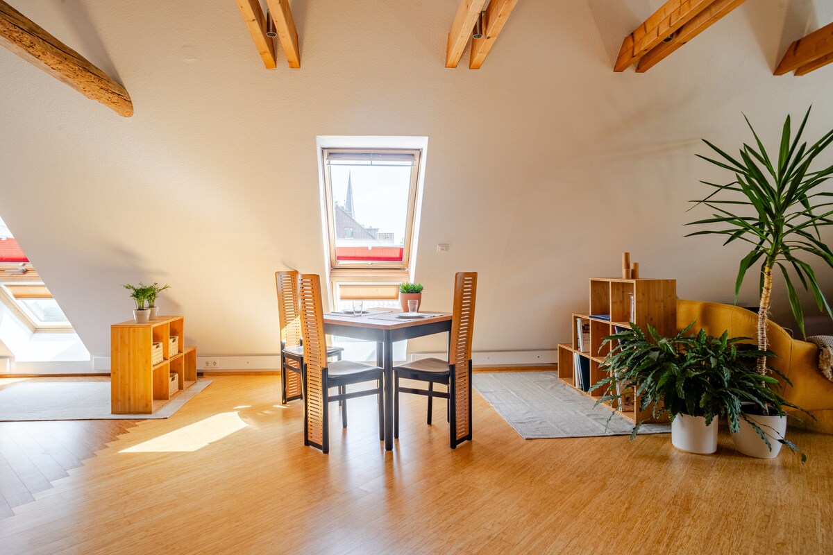 Im August 2021 fertiggestellte Dachgeschosswohnung mit ruhiger Lage in der Ortsmitte. Der Wohnbereich ist offen gestaltet und bietet einen Blick bis in den Giebel, die gut ausgestattete Einbauküche wurde in das offene Konzept einbezogen. Die Wohnung ist mit Fußbodenheizung und Bambusparkett ausgelegt und besitzt zusätzlich einen Kaminofen Der Blick durch die bodentiefen Fenster fällt auf die ruhige Wohnstrasse oder das Gründach. Das Tageslichtbad ist mit einer Viertelkreisdusche ausgestattet.