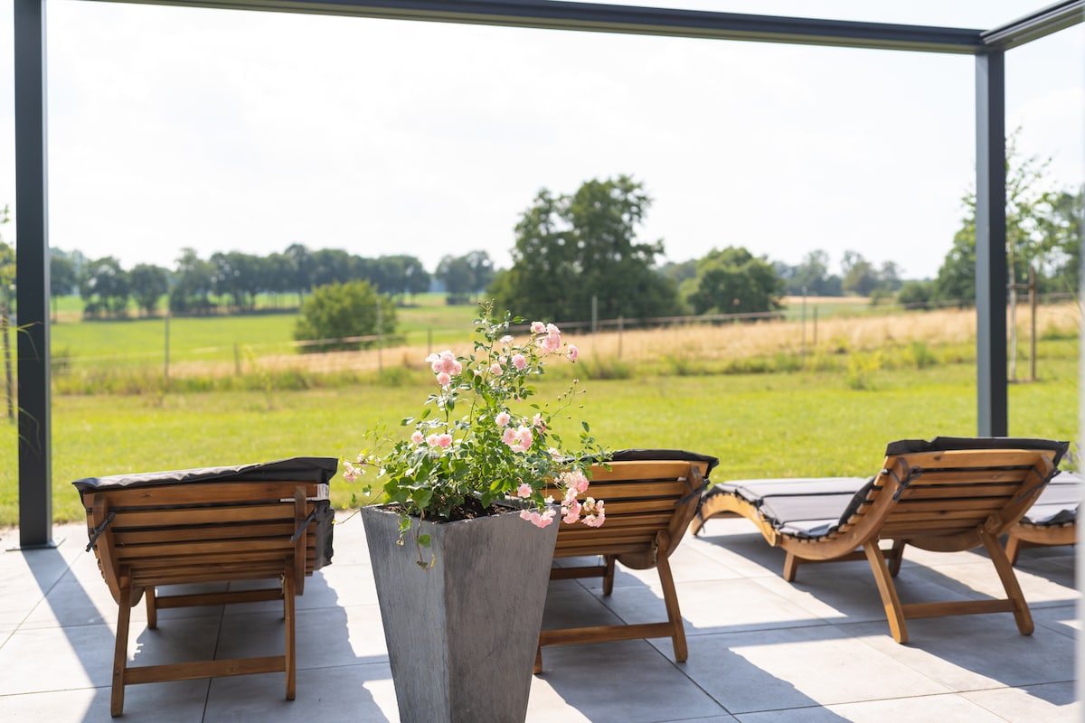 Unser im Juni 2023 neu ausgestattetes Ferienhaus auf dem Land bietet euch viel Platz im stilvollen Design. Entspannt euch in der Sauna, kocht gemeinsam in der hochwertigen Küche und erfreut euch an dem tollen Ausblick ins Grüne aus nahezu jedem Raum. Im Studio könnt ihr euch sportlich betätigen oder einfach entspannen. Auf 250 qm findet ihr alles was das Urlaubsherz begehrt - fühlt euch wie zuhause.