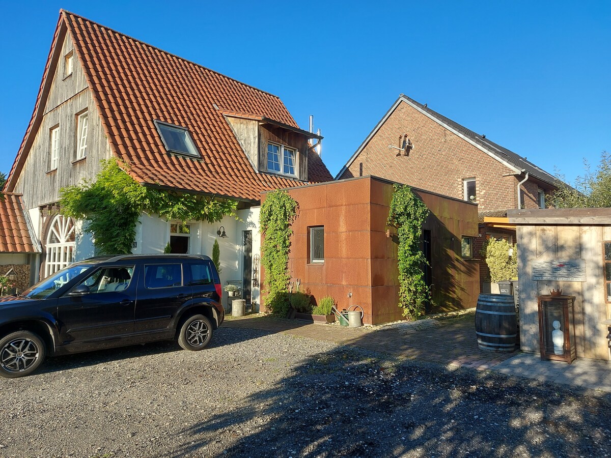 Sonnig, großer Garten, familienfreundlich und Feuerstelle: Die schöne Ferienwohnung in einem ausgebauten Stall ist ideal für Menschen, die Ruhe, Auslauf und Natur suchen. Ihr könnt Lagerfeuer machen, Fahrradausflüge oder in der Gaube sitzen und die unverbaute Aussicht über Garten und Weiden genießen. Ein schöner Badesee ist per Fahrrad zu erreichen. WLAN (ca. 23/7 MBits) und Waschmaschine sind ebenso vorhanden wie zwei eigene Eingänge. Die Sauna kostet 10€ für 2 Stunden, jede weitere Stunde 5€.