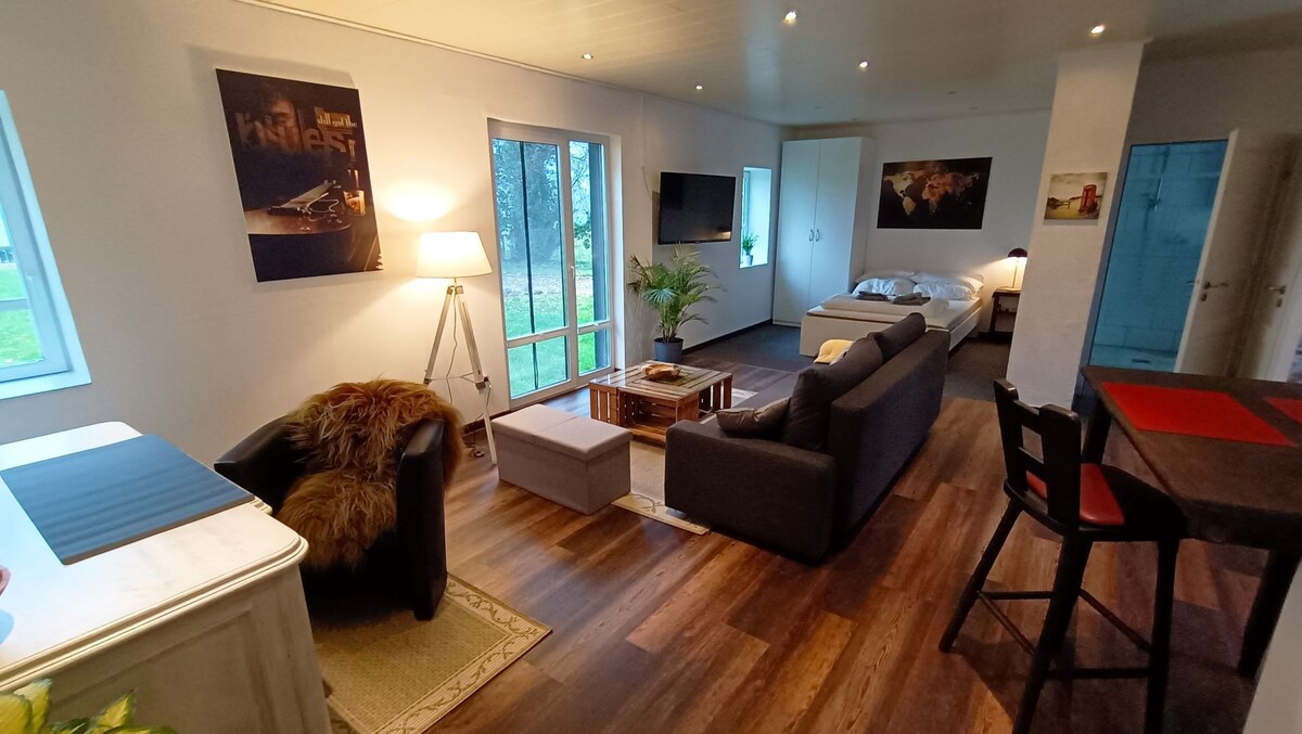 Ich bin eingerichtet, damit Ihr Entspannung und Wohlbefinden findet. Durch meine große Fensterfront schaut Ihr ins Grüne... auf eine große Wiese, Bäume und Büsche. Mich gibt es schon seit 50 Jahren… auch wenn wir Tiny Houses gerade in Mode sind, ich habe schon viel erlebt… aber ich bin kürzlich renoviert worden und freue mich auf interessante Gäste!