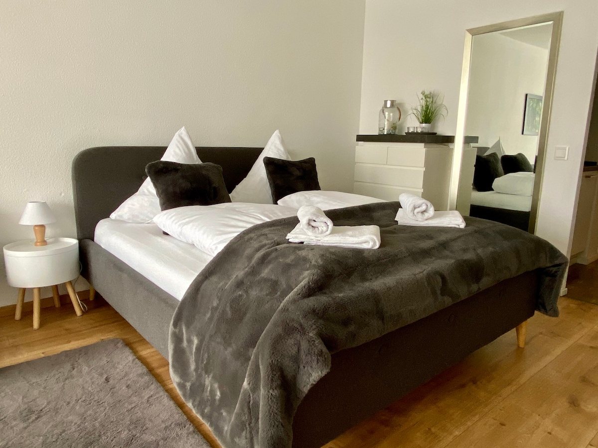 Quiet and central. Relax in our bright, freshly renovated 75 m² apartment—perfect for business travelers, those seeking peace and quiet, or city explorers. Cozy living and dining area Bedroom with a box spring bed Sofa bed in the living room Fully equipped kitchen View of greenery Private terrace Breakfast and Luch on demand