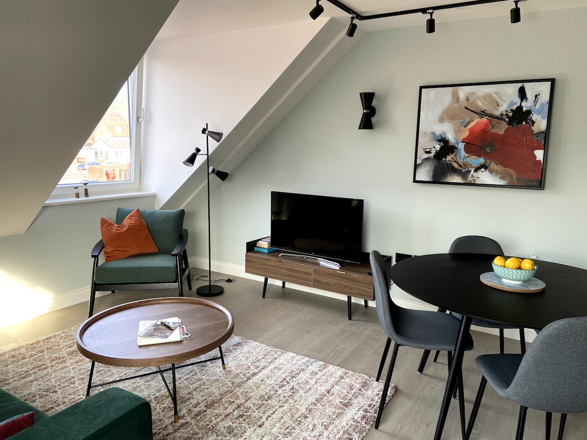 A lovely indendant apartment at the bottom of our garden secluded by trees . the apartment has a nice outside area with patio table and chairs . Inside there is a large open plan kitchen , dinner, lounge with a sofa bed and a well equipped kitchen with double oven , fridge freezer , dishwhaser , whashing machine microwave , toaster, kettle and much more . theres a large smart tv and wifi , dinning table . bedroom with king size bed and built-in wardrobe . bathroom with walk-in shower .