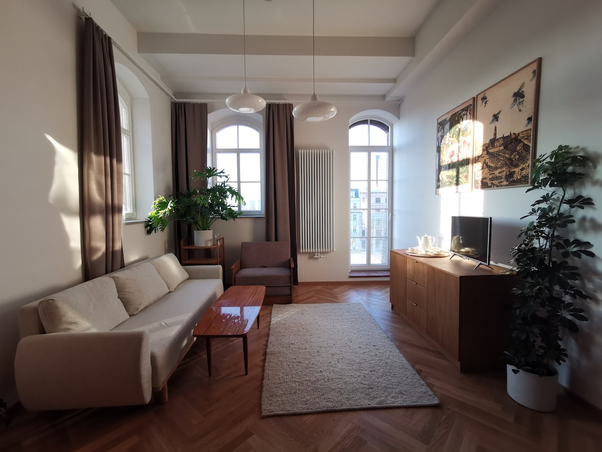 Nietuzinkowy, komfortowy loft znajduje się w, słynącej z wydarzeń kulturalnych i tętniącej kawiarnianym życiem, Dzielnicy Czterech Świątyń. To jedno z najbardziej magicznych miejsc spotkań wrocławian. Klimatyczne, designerskie studio w pięknym, zabytkowym budynku, z balkonem z widokiem na fosę, oświetlone ciepłymi promieniami słońca, jest wymarzonym miejscem na wyjątkowy pobyt we Wrocławiu dla pary lub rodziny. Parking miejski na ulicy pod samym domem.