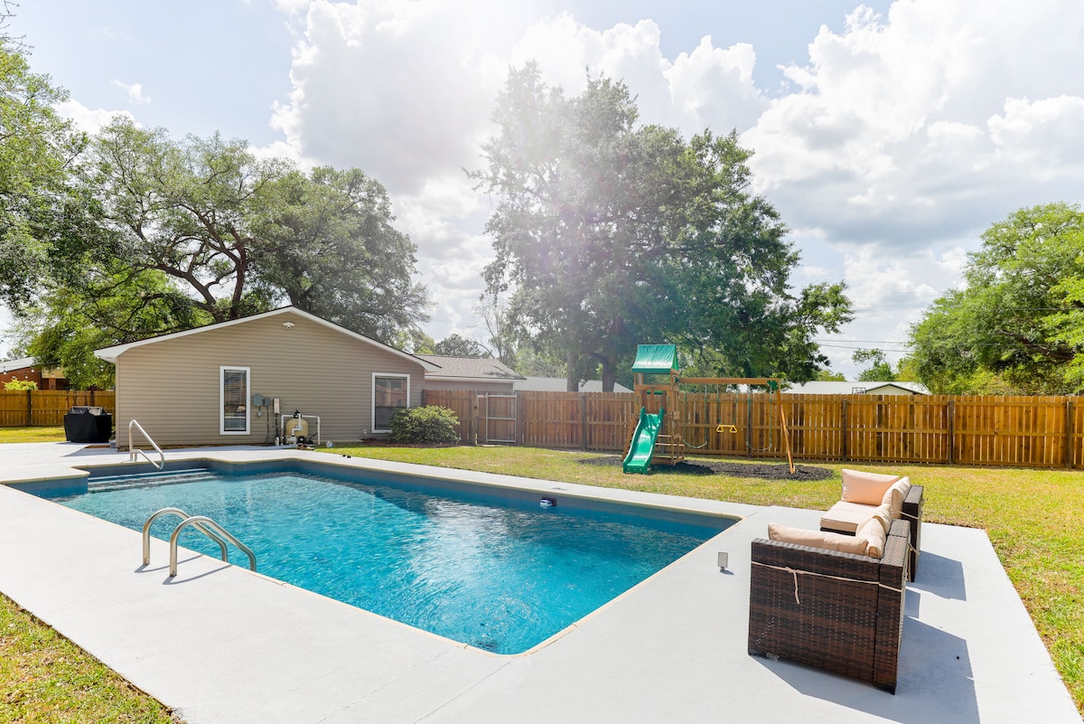 Relax in this spacious retreat packed with entertainment and comfort for families or groups. •3 king beds with TVs in every bedroom, living room, and game room •Game room with Pac-Man arcade, pool table, foosball, and flat-screen TV •Covered porch with life-size Connect 4, ring toss, and seating area •Outdoor porch with grill and additional seating •Fully equipped kitchen and dining space •5 smart TVs and free Wi-Fi throughout •Washer and dryer for convenience •17 minutes from Wild Adventures