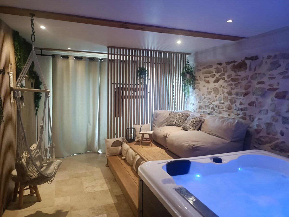 Escape to the third of our charming gîtes for 2 to 4 guests, just a stone’s throw from Lyon, in the quaint village of Vaulx-Milieu. This peaceful retreat combines rustic charm with modern comfort for a unique and unforgettable getaway. Relax in our private spa on the ground floor, featuring a 4-person jacuzzi and infrared sauna. Upstairs, the air-conditioned living area includes a kitchen, living-dining room, bathroom, and 2 bedrooms. The accommodation is entirely private. PARTIES ARE NOT ALLO