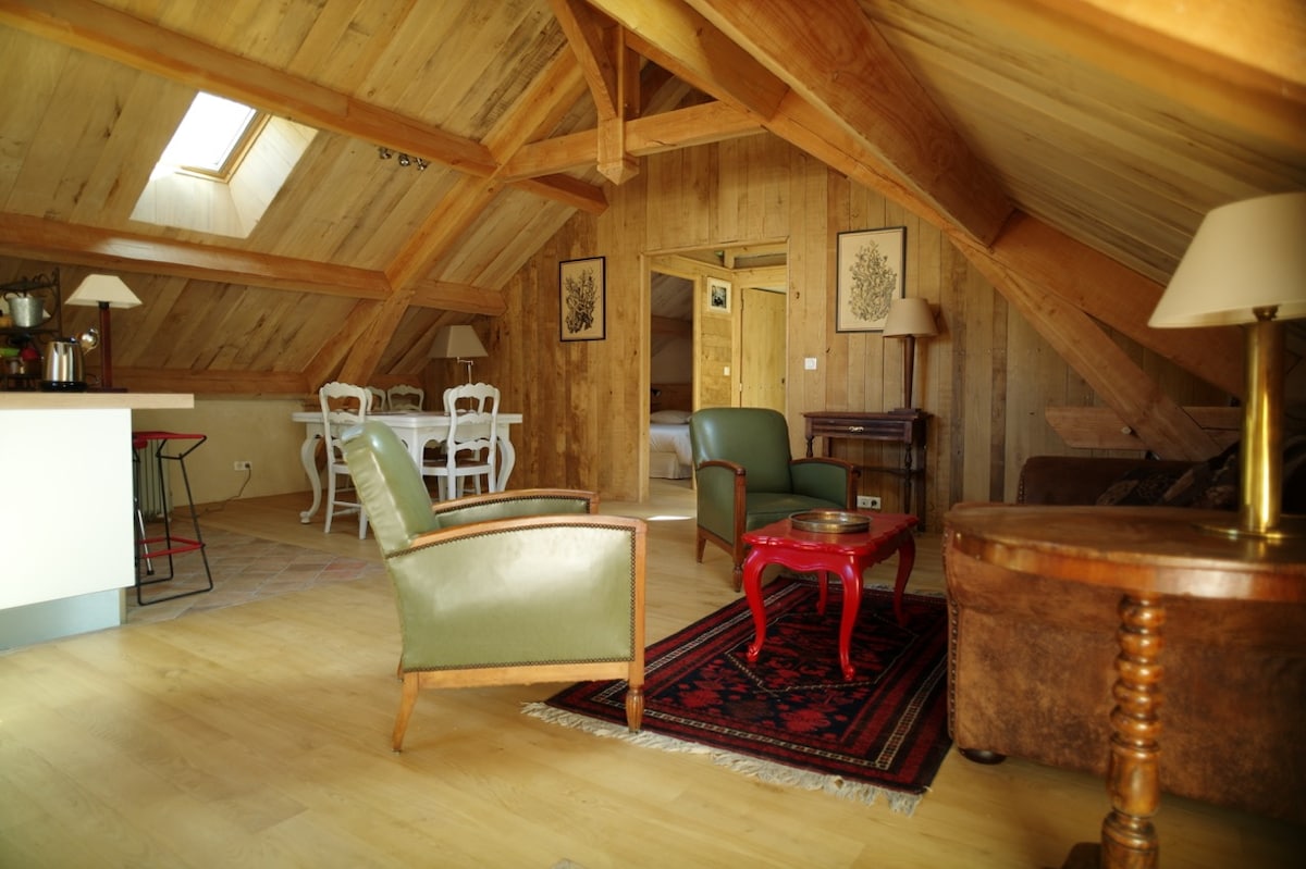 Au cœur du village dans un ancien couvent des 16ème et 18ème siècles un joli duplex cosy de 55m2 vous attend. Situé au 1er et deuxième étage du bâtiment le plus ancien sa grande chambre en mezzanine sous voûte, est idéale pour un couple. Dans la pièce à vivre un lit d'appoint 1 personne peut être rajouté. Salle de douche et WC séparé mais nécessitant de passer par la chambre. Dans la cour intérieure commune vous pourrez vous installer pour lire ou déjeuner (mobilier extérieur).