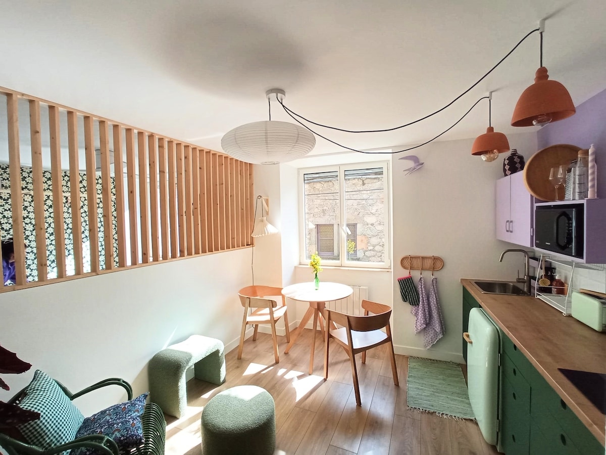 Studio moderne et lumineux au rez-de-chaussée d'une maison de village rénovée. Coin cuisine tout équipé, coin salon avec un canapé-lit plus un lit une place et une salle de bain séparée avec machine à laver. Terrasse exposée sud et cour privative. Pas de wifi, seul Orange passe bien. Attention, les équipements spéciaux (4 pneus neige ou 4 pneus quatre saisons ou chaînes à neige) obligatoire du 1er novembre au 31 mars en Lozère.