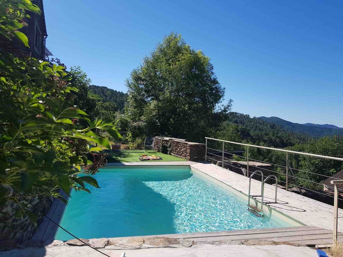 Appartement belle rénovation dans grand mas cévenol. Très belle vue sur le mont Lozère et sur la vallée, accès piscine, rivière a proximité. Dans un petit hameau de 5 maisons, Orienté Sud sud-Ouest, en pleine montagne, 1 Chambre avec lit double en 160, et deux lits simples en sous pente, literie neuve. Grande terrasse et forêt environnante. Entièrement équipé a neuf.