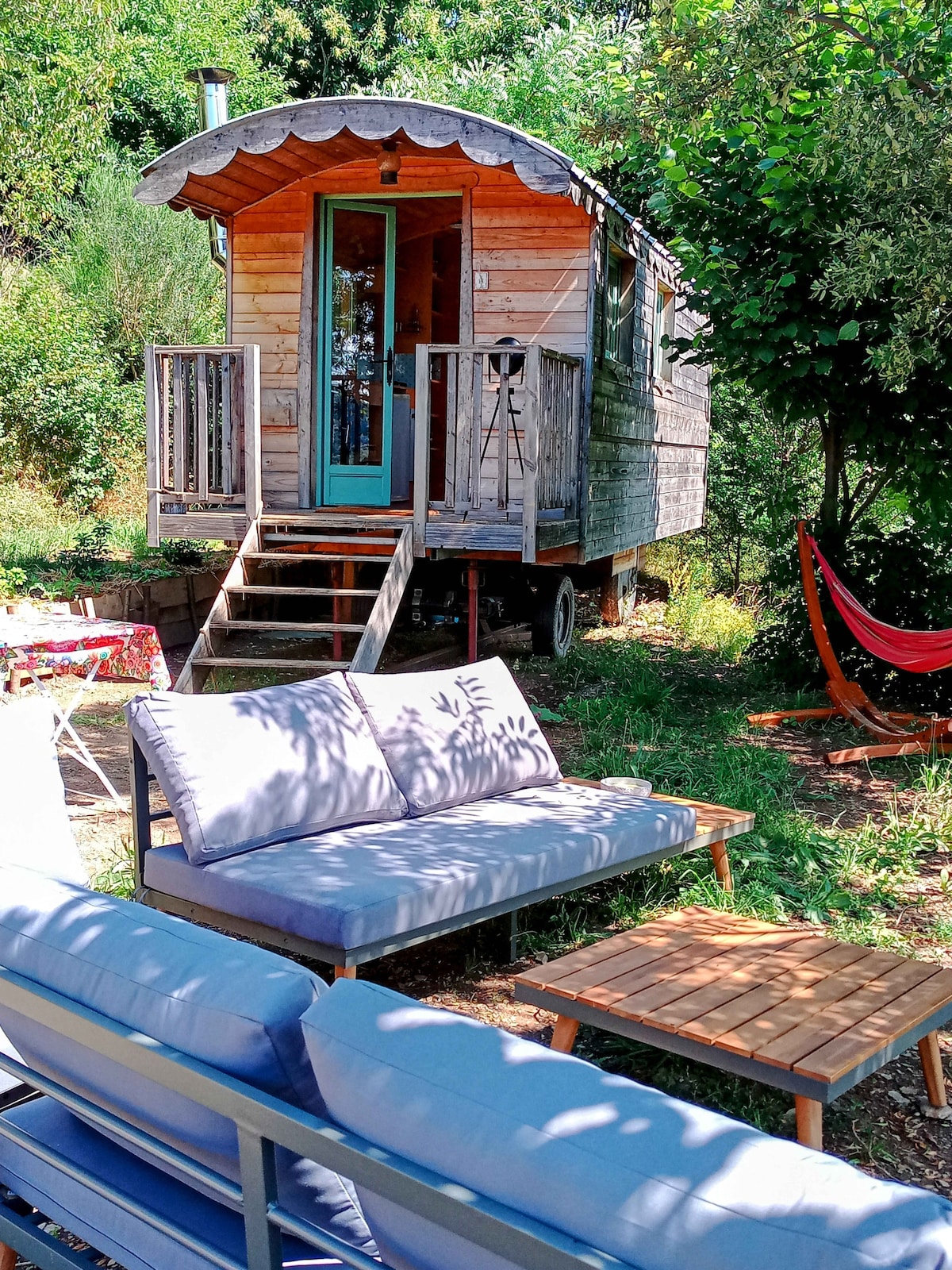 Nichée dans les montagnes du parc National des Cévennes, entourée de châtaigniers, de tilleuls, de chênes, de lavandes et de romarins, notre roulotte éco-responsable vous accueille dans un cadre unique et préservé. De la fenêtre ou de la terrasse, confortablement installé dans le canapé ou le hamac, admirez la vue époustouflante sur la vallée du Galeizon. Détente et lâché-prise seront au rendez-vous de votre séjour !