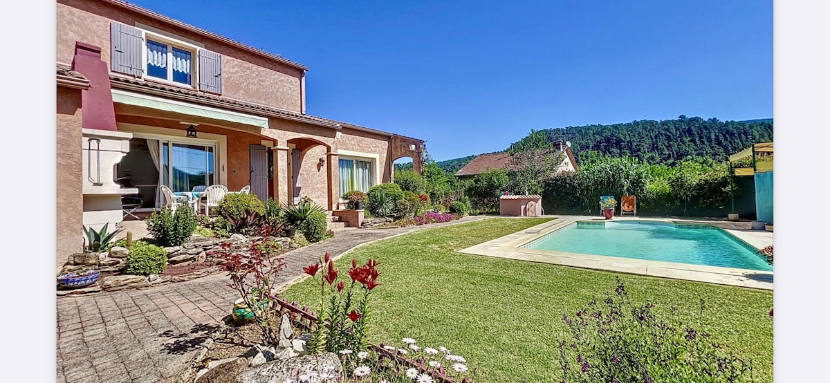 Au cœur du Parc national des Cévennes, sur un terrain arboré de 6000 m2, villa au calme, composée d'une grande pièce à vivre, de 4 chambres dont une suite parentale, d'une salle de jeux, de 2 salles de bain, d'un coin bureau et d'une grande terrasse avec vue sur les montages. Maison idéale pour les familles avec cabane, terrain de pétanque, rivière à quelques minutes en voiture (accessible également à pied en 20 minutes), nombreuses randonnées, magnifiques nuits étoilées.
