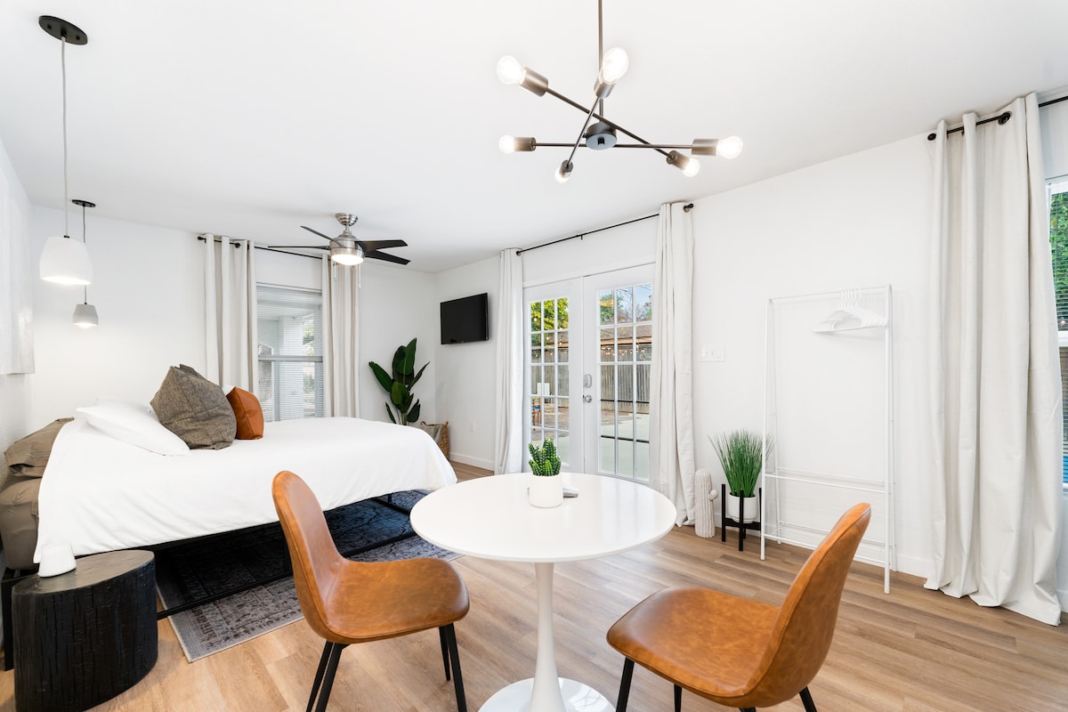 This charming studio is located in the heart of Tech Terrace! Designed for guest comfort and conveniently located near J&B Coffee, Capital Pizza & Goodline Brewing. Featuring a well stocked kitchenette with cooking/eating utensils, Keurig coffee maker, oven & microwave. Watch your favorite shows on a 50" RokuTV (Netflix, Hulu, & Amazon Included). Enjoy easy self check-in via personal access code sent prior to arrival.
