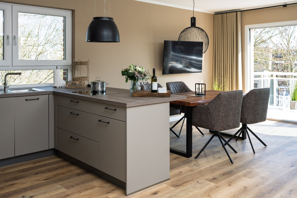 Discover the modern holiday apartment "Hafenkino 23 - BeachBay" in Travemünde at the Priwall. With 82 m², this tastefully furnished accommodation offers space for up to four people and boasts two bedrooms, a spacious living room, and an open-plan kitchen. Enjoy the sun on the covered terrace with sea views or relax in the in-house sauna and whirlpool. Just 300 meters from the fine sandy beach, this is the perfect place for a relaxing vacation.