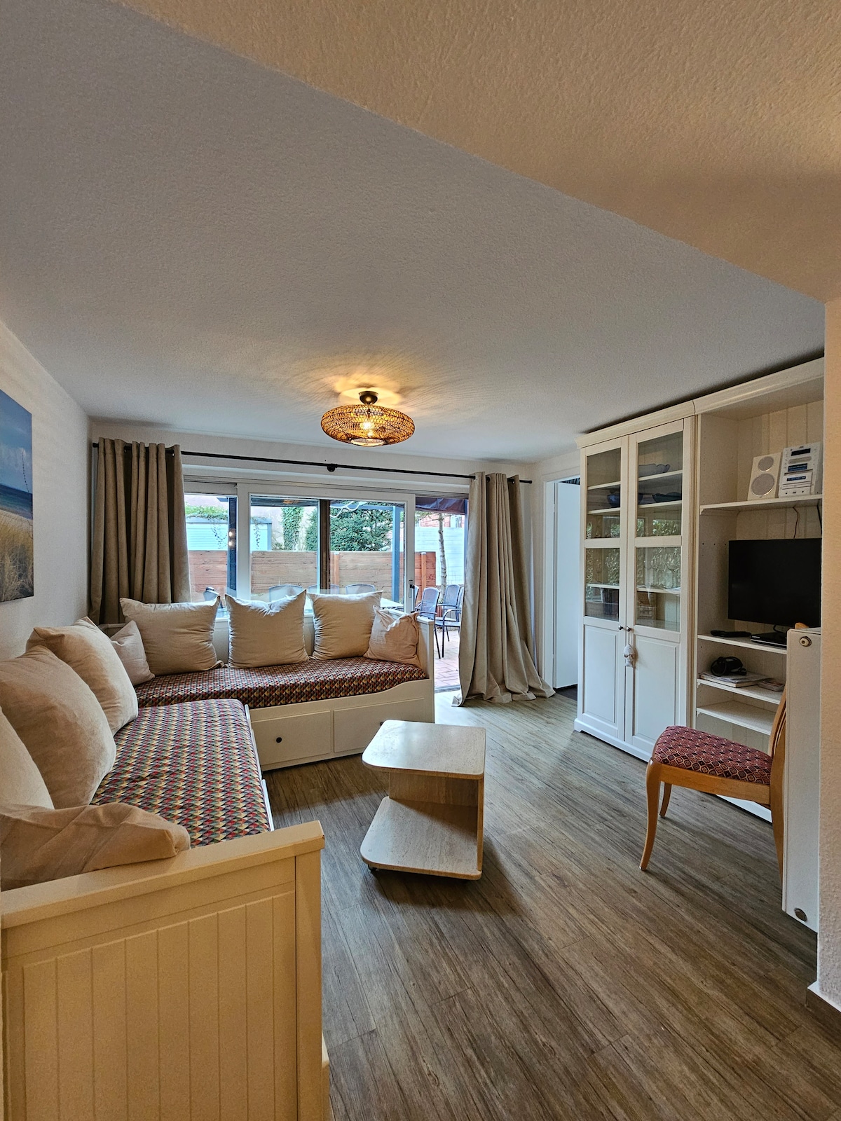 Zentrales voll eingerichtetes und ausgestattetes laufend renoviertes Wohn-Schlafzimmer-Apartment mit überdachtem Balkon (34qm) - amtlich genehmigte Ferienwohnung. Ein Doppelbett von 1,60 m x 2,0 m mit orthopädischer Matratze: für 2 Personen - neben einem 2-sitzigen bequemen Sofa. Auf Anfrage kann eine Zusatz-Matratze (0,90x 200 m) ins Apartment gelegt werden. WLAN und TV- mit Hunderten von Kanälen via Kabel inkl. Radio und CD- Player sind vorhanden.