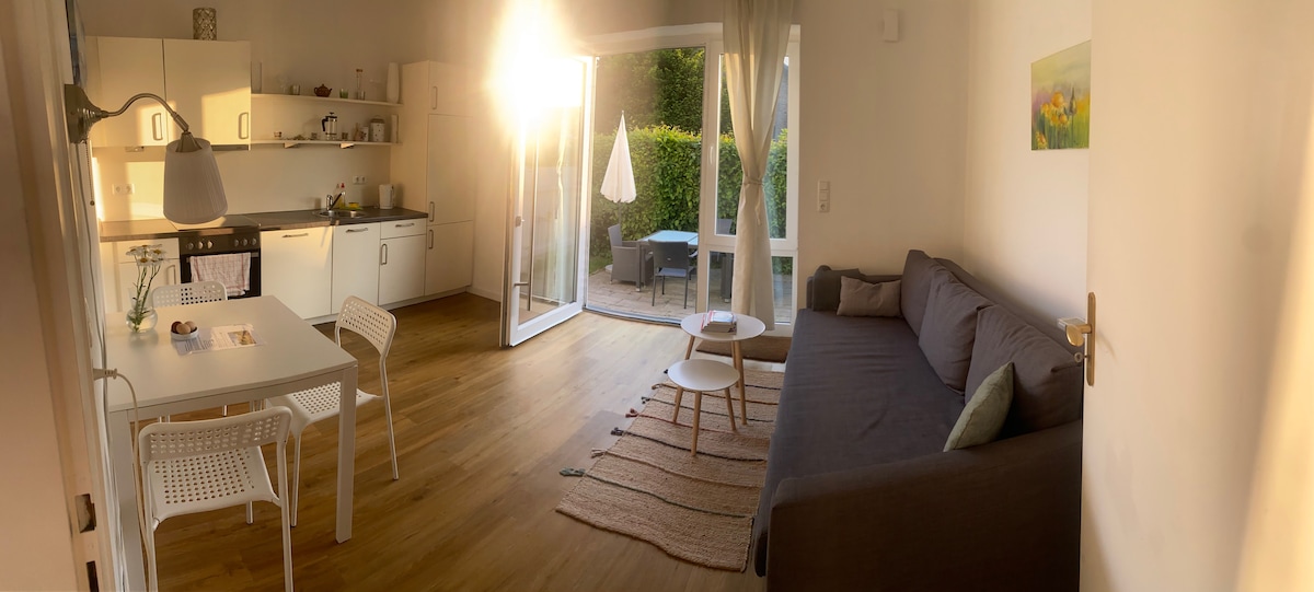 The bright, sunlit terrace apartment in the heart of Lübeck features two lovely rooms, a bathroom, and an additional walk-in wardrobe. The generous sunny terrace invites you to relax in the greenery. The living space is approximately 50 square meters. Parking spaces are available directly in front of the building. The historic old town island, the Wakenitz, and the city park are right outside. The Baltic Sea is about 12 km away. Children as well as beloved pets are welcome.