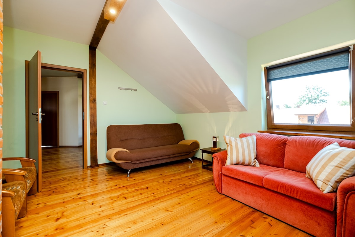 Do you have enough courage to visit the heart of Polish countryside? Don't worry! Is doesn't have to be that hard!Our house is beautifully situated among the fields and forests, far away from everything. You may get in touch with domestic and even some wild animals, experience the silence and quiet. But at the some time you'll find yourself in a place, where hosts know what you may need, because we travel too.