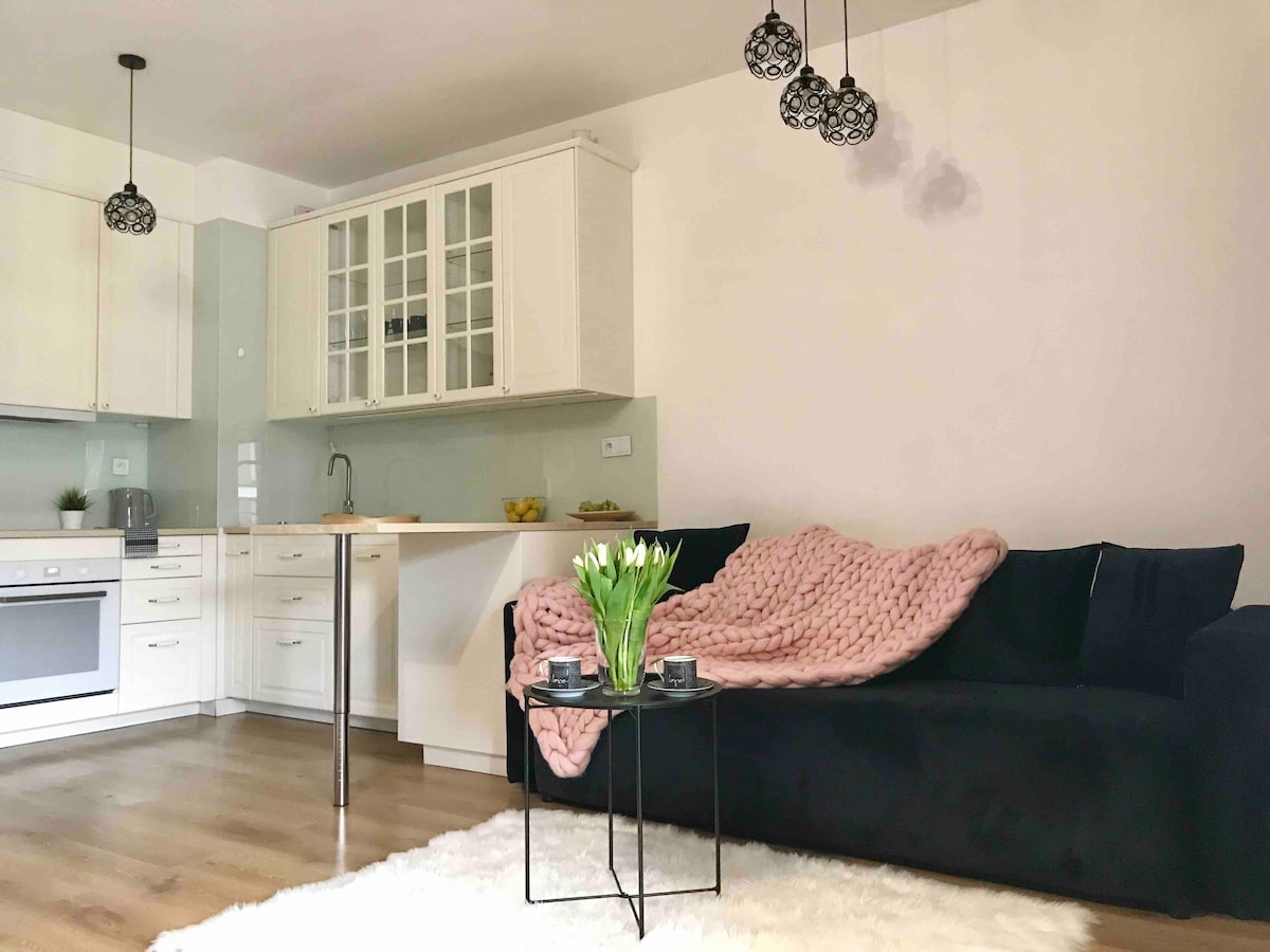Mieszkanie w budynku z 2015, nowocześnie urządzonym, z bezpłatnym dostępem do siłowni, squash'em i fitness za dodatkową opłatą. W mieszkaniu pościel , ręczniki, woda mineralna, wyposażenie kuchenne (talerze, garnki, sztućce, szklanki), zmywarka, lodówka, płyta indukcyjna, piekarnik. Internet (wi-fi), telewizja (z dostępem do internetu) w cenie. Na miejscu kawiarnia. Do centrum 3 km (10 minut samochodem).