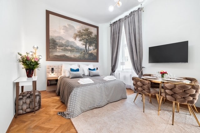 Elegant apartment in central Lublin, next to Plac Litewski and a short walk from the Old Town and Deptak promenade. Features large room with plush king-size bed, sofa bed, dining table, private balcony, and separate kitchen with coffee machine, tea and coffee and a private, modern bathroom with shower. Includes WiFi, flat-screen TV, all kitchenware, hair dryer, iron with ironing board, bathrobes, towels, and toiletries. Ideal for couples, families, or business guests seeking comfort and style.
