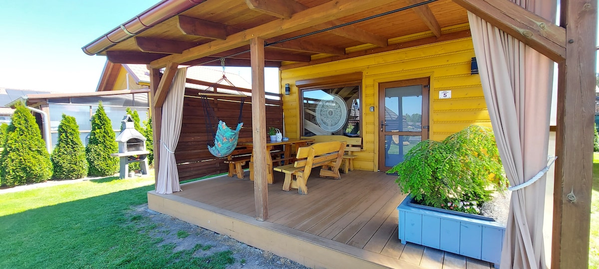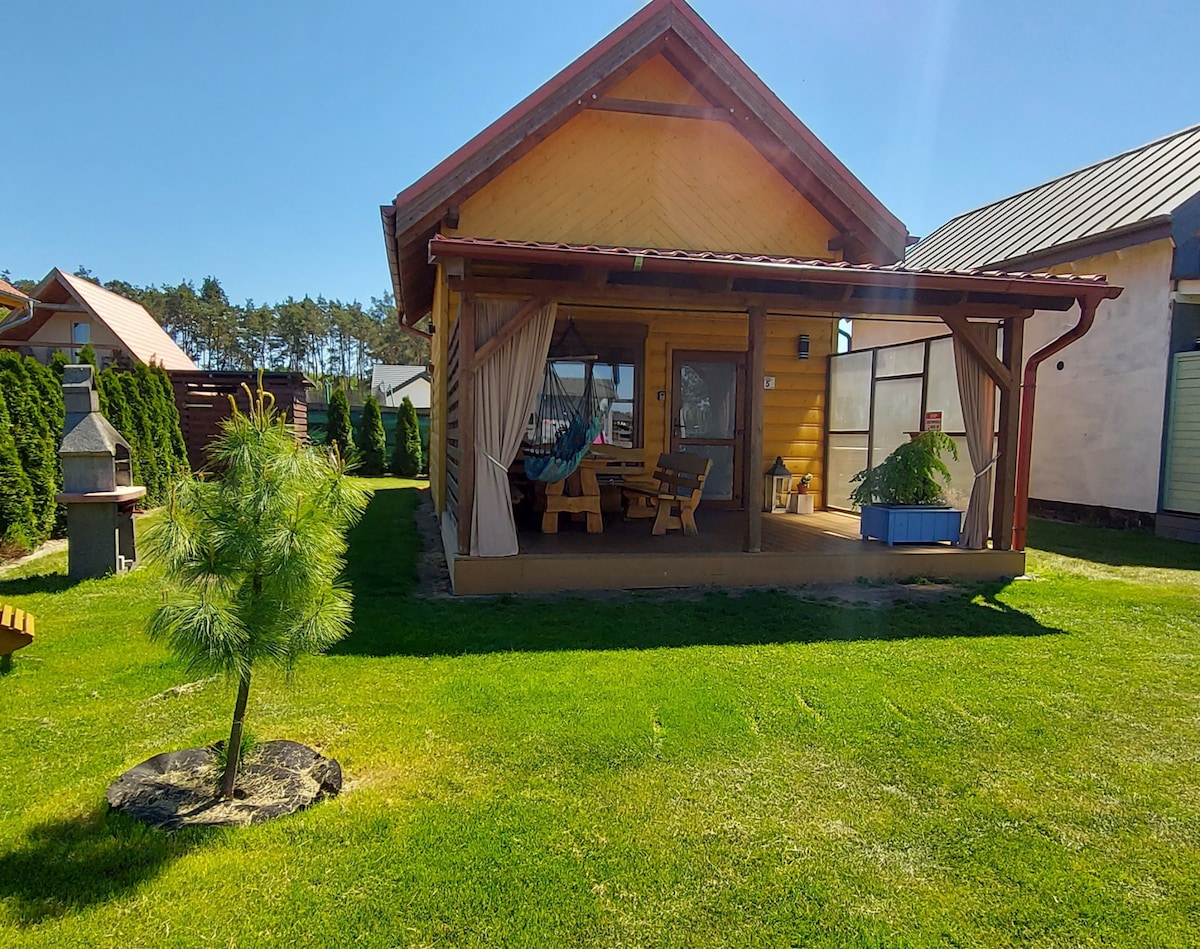 Domek 3-osobowy z 1 sypialnią z łóżkiem małżeńskim i dodatkowym łóżkiem podwieszanym na pięterku. Dodatkowo możliwość spania w salonie na wygodnym narożniku – maksymalnie 2 osoby. Za każdą dodatkową osobę w domku 60zł/osobę/dobę. Dzieci do lat 7 nie liczymy do ilości osób w domku – przy czym maksymalna ilość wszystkich osób w domku to 5. Ponadto w cenę jest wliczone korzystanie z basenu, sauny, balii, rowerów i sprzętu rekreacji wodnej.