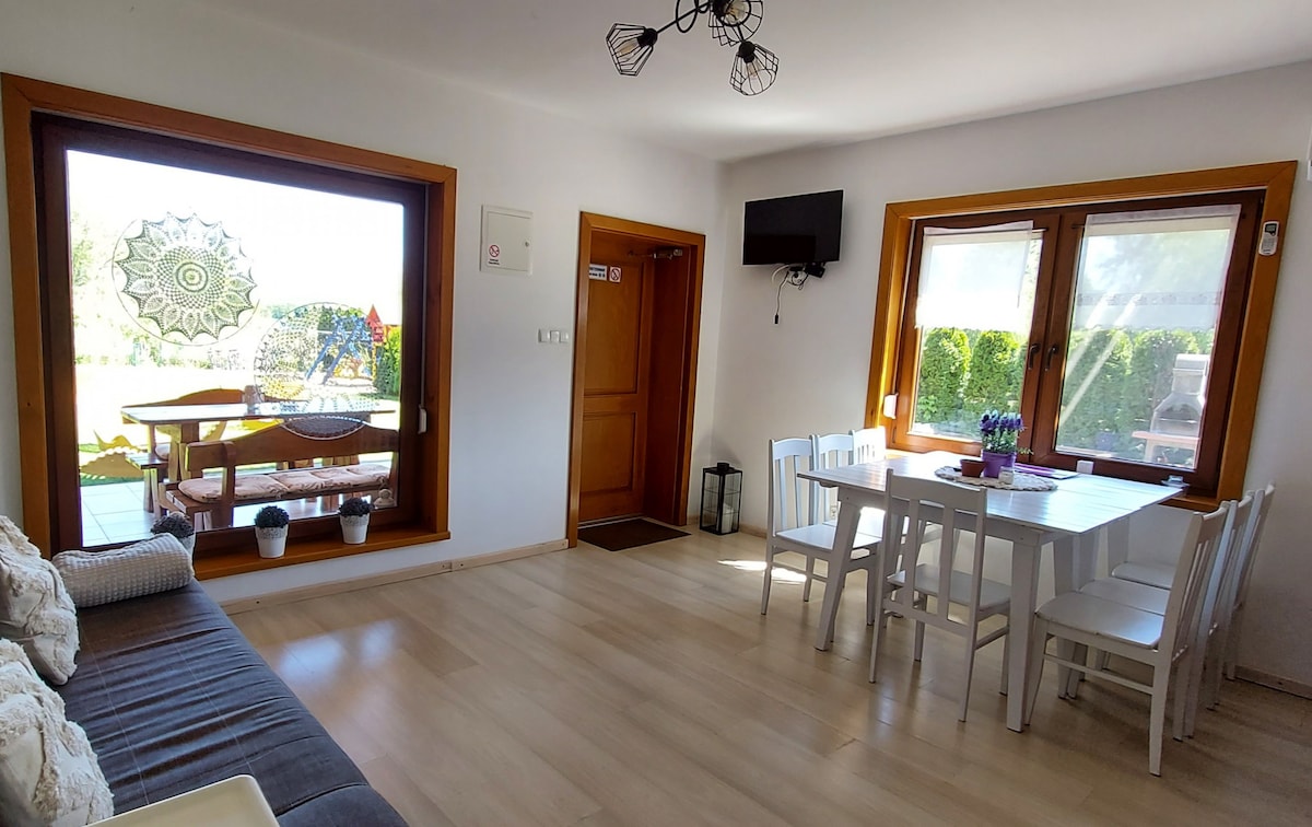 Do Państwa dyspozycji oferujemy Domek o powierzchni 100 m2: PARTER: salon z w pełni wyposażonym aneksem kuchennym, sypialnia 2-osobowa, łazienka, duży taras. W salonie znajduje się narożnik rozkładany, oraz piec typu koza. Piętro: 3 sypialnie 2-osobowe, łazienka. Cały dom jest ogrzewany, klimatyzowany co pozwala na całoroczny wypoczynek. Do dyspozycji gości 2xdeska typ SUP, 4x rower. W ogrodzie JAKUZZI (czynne w okresie temperatur (+++) Obiekt ogrodzony z garażem i parkingiem na terenie posesji.