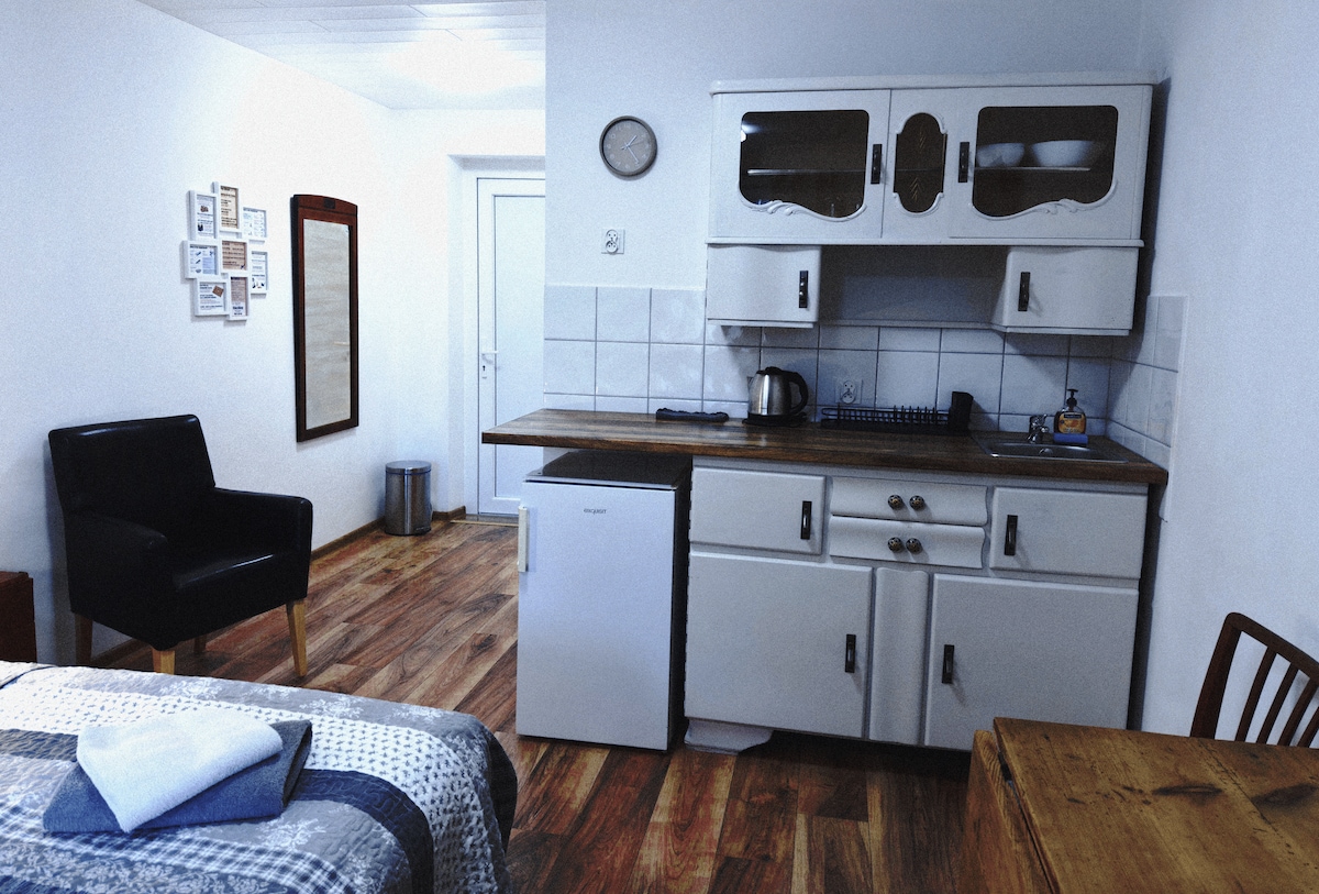 Wilczy Apartament-jest poddaszem domu jednorodzinnego zaaranżowanym na potrzeby gości. Składa się z dwóch przestronnych sypialni-w każdej jest duże łóżko oraz rozkładana sofa; salonu z wyposażonym aneksem kuchennym, w którym znajduje się rozkładana kanapa; oraz łazienki. Częścią współdzieloną z gospodarzami jest zamknięty wiatrołap, z którego prowadzą schody na piętro. Z racji tego że zamieszkujemy parter, preferujemy spokojnych gości, rodziny z dziećmi. Nie wyrażamy zgody na organizację imprez.