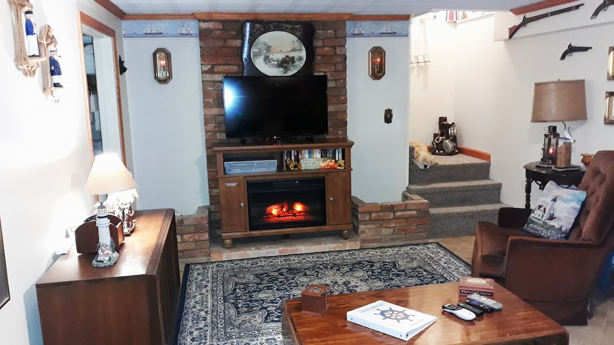 Lockbox entry to the completely private entry basement level includes; sitting area with sofa, chair, large screen Fire TV/; WiFi/ fireplace; queen bed & chest. (Rollaway bed available). A separate side room includes a private shower, sink, eating area with table & chairs, refrigerator, toaster, microwave, & coffee maker; (light breakfast included). The private half bath is located on the main floor at the top of the stairs inside entrance area. Private parking space in front of the home.