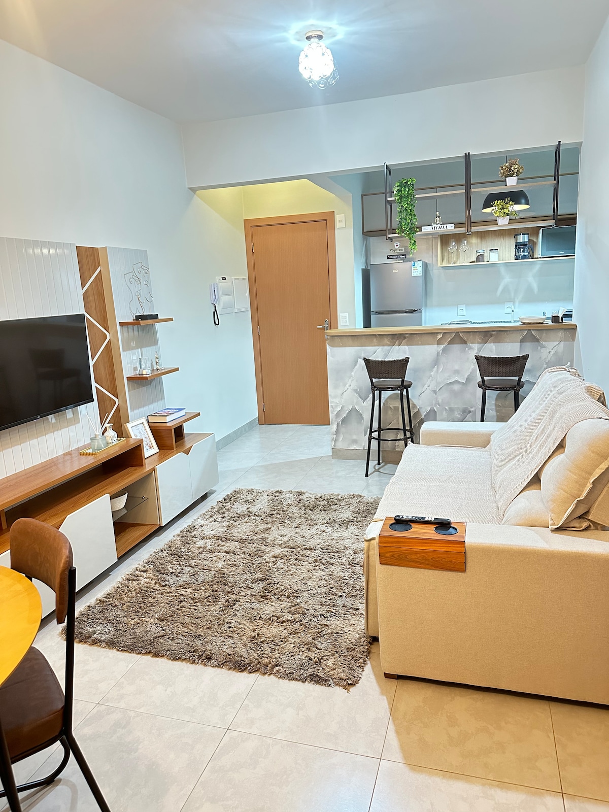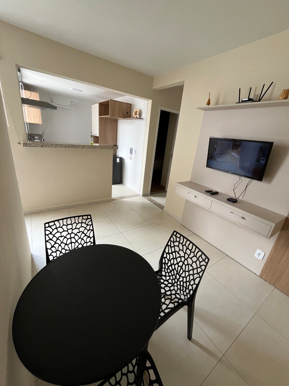 Apartamento mobiliado com todo conforto necessário para estadias longas: ar condicionado na sala e dois quartos, itens de cozinha, máquina de lavar e utensílios.