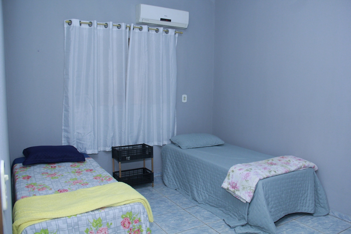 CASA COM 2 QUARTOS em bairro tranquilo e familiar. 2 quartos, que acomodam 3 pessoas em camas, e podemos disponibilizar até + 2 colchões extras acomodando até 5 pessoas dentro dos quartos com ar. Estacionamento interno fechado. Entrada de pedestres sem veículo por portão com cadeado e entrada de veículos por portão de elevação manual. Para feiras ou eventos consigo colocar mais colchões.