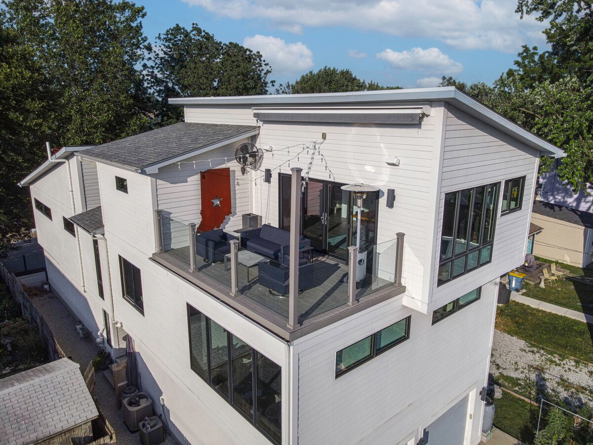Welcome to Irish Hill, nestled between Fountain Square and Holy Cross neighborhoods ,in downtown Indy. Second floor has an open floor plan ,with modern kitchen ,with all the amenities , dining room, living room with a pull out couch , half bath and access to the rooftop patio ,with skyline of downtown.First floor consists of two bedrooms /queen size beds, bath suite attached to each bedroom.The downstairs patio has a 4 person hot tub. Free parking. Close to everything downtown.