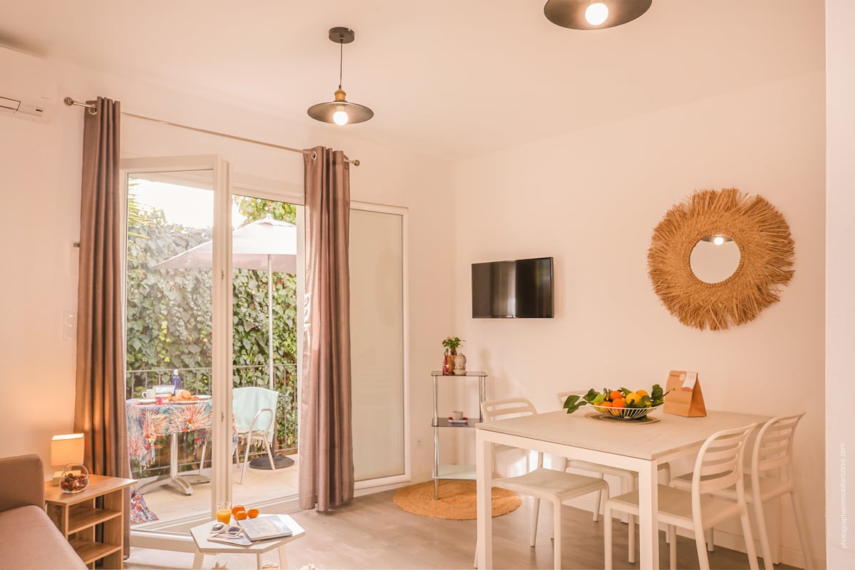 Situe a 200m de la plage, à 10 min de l'entrée de Bastia et au sein d'une résidence sécurisé et calme cet mini villa T2 de 45m2 vous apportera tout le confort nécessaire pour passer d'agréables vacances. Le logement a été rénové récemment avec goût, et nous y avons intégrés tout le confort nécessaire pour que vous y passiez un agréable séjour : Wifi fibre optique, climatisation dans le séjour et la chambre, chauffe serviette soufflant dans la salle de bain, MyCanal, Netflix, Disney+