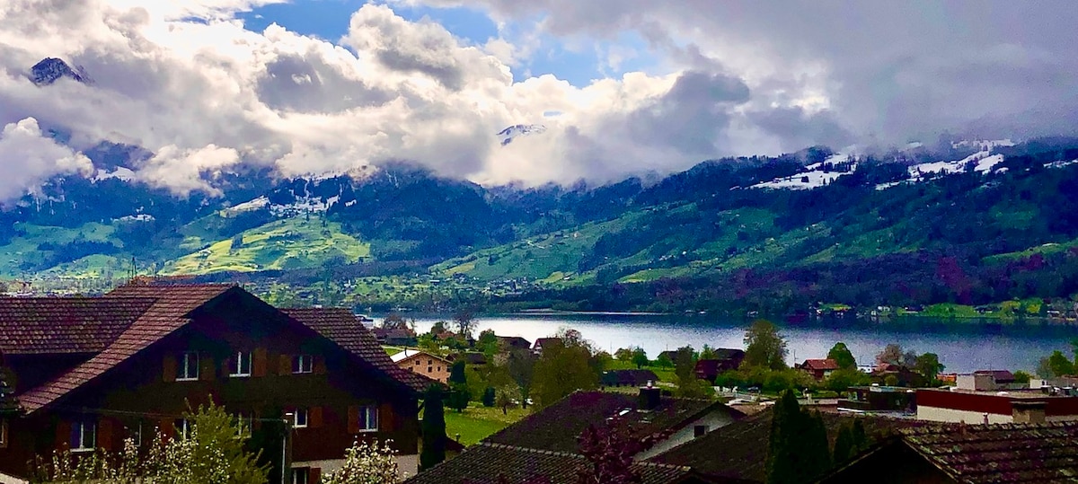 Private suite on the top floor of the owner-occupied Villa Wilen, directly on Lake Sarnen, unique alpine views, sunrises Spacious bedroom with home cinema, the panoramic lounge, large kitchen and bathroom (all privat area). For 3–5 guests, an additional private bedroom with bathroom is provided one floor below (lift access - shared area). Lake and garden access, SUPs, free parking & WiFi. Children welcome, small dogs only. Most popular Swiss Airbnb. Most highlights are reached within 1 hour.