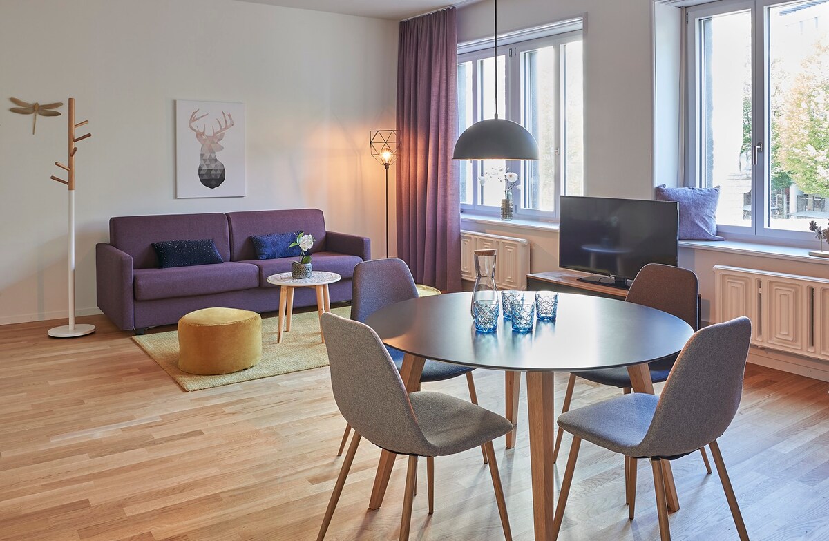LUMEN APARTMENTS. Bright. Spacious. Modern. Fully furnished 1-room apartment for a maximum of 2 people. Spacious, bright, and includes all the amenities needed to sleep comfortably and work efficiently. Extra comfortable for couples or for lone travelers who need some extra room. 1 Cosy apartment is furnished handicap-accessible.