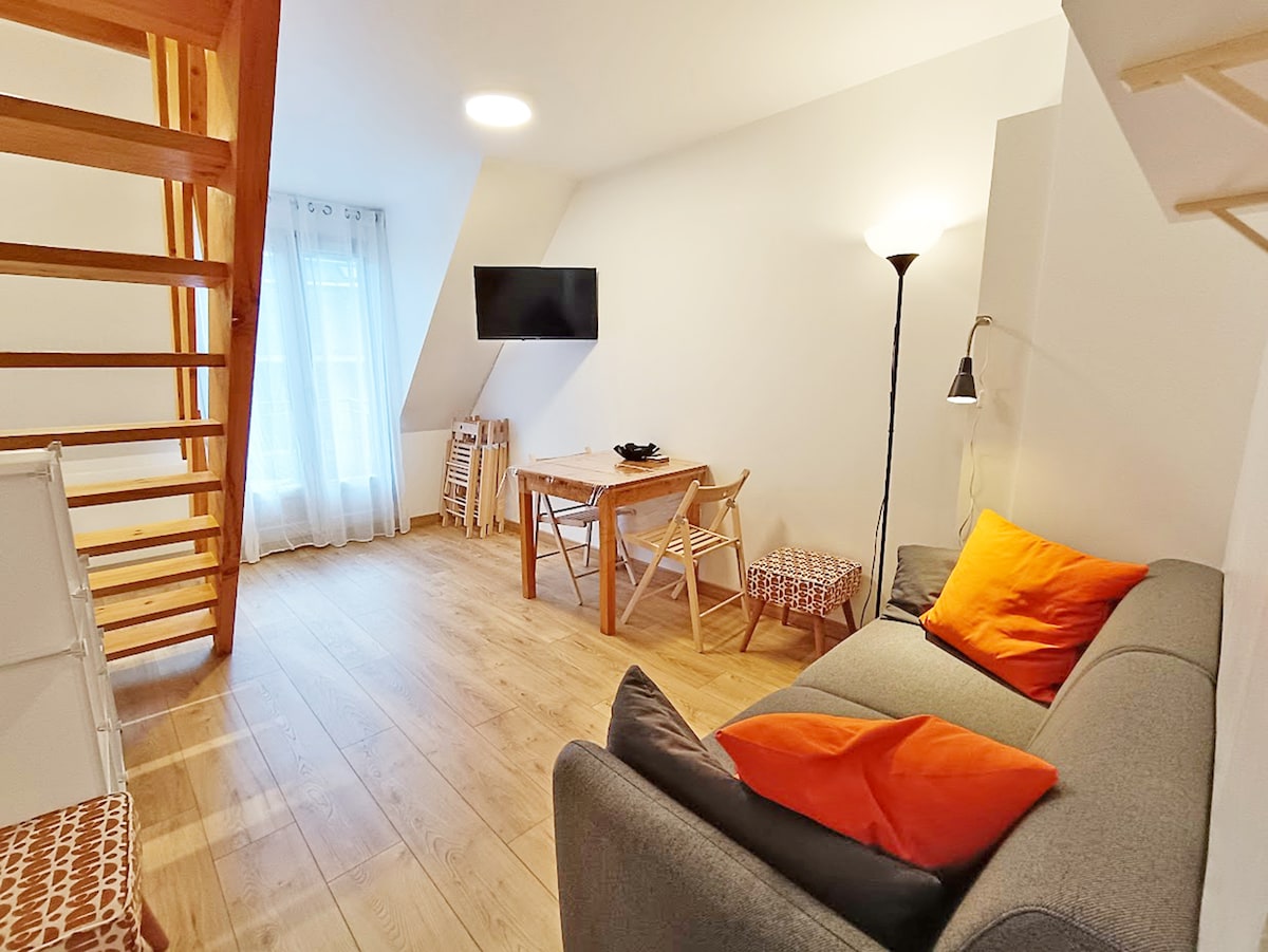 Centre ville dans un petit pavillon de plein pied situé dans un jardin calme, studio neuf de 27m2. En rez de chaussé: cuisine, salle de bain complète, WC indépendant, salon-salle à manger canapé convertible, grand couchage à l'étage dans mansarde aménagée avec accès par échelle de meunier escamotable Possibilité de rangement pour vélos skis .. Ainsi qu'un coin jardin aménagé . Les 10 Euros concernent la fourniture et l 'entretien du linge la propreté du studio est à votre charge.