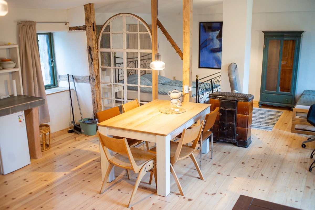 Die Wohnung befindet sich in einer 100 Jahre alten Scheune eines idyllischen, 26 Seelen Dorfes inmitten (fast) unverbauter Natur am Rande der Lüneburger Heide. Es ist eine Gegend ohne Superlativen. Alles sehr normal ohne grosse Attraktionen. Dies ist aber genau das was wir an dieser Gegend sehr schätzen. Viel Natur, weite Sicht und wenig Ablenkung. Es ist ein Ort an dem man zur Ruhe kommen und Kraft schöpfen kann.