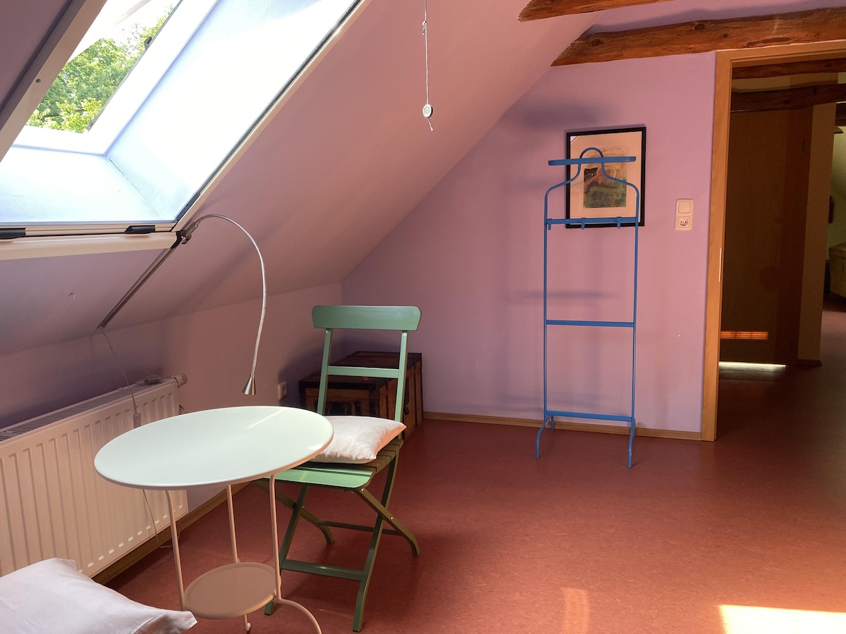 Das Ferienzimmer (7qm) verfügt über einen separaten Eingang und besticht durch kuschlige Gemütlichkeit. Trotz der sehr kleinen Größe ist alles vorhanden, was man zum Entspannen braucht. Das Sofa mit Einzelbettgröße und kann auf die doppelte Breite ausgezogen werden. Dem gegenüber befindet sich eine Essecke, ein Flachbild-TV und der Zugang zum Tageslicht-Bad mit Dusche. Zusätzlich befindet sich im Bad die kleine Miniküche. Eine Elektroherdplatte, sowie Töpfe, Geschirr und Besteck sind vorhanden.